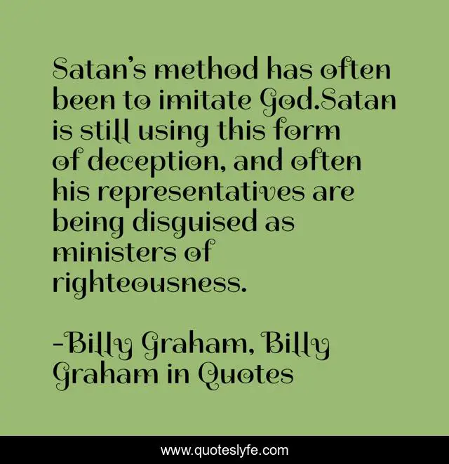 This page presents the quote "Satan’s method has often been to imitate God.Satan is still using this form of deception, and often his representatives are being disguised as ministers of righteousness.". Author of this quote is Billy Graham, Billy Graham in Quotes. This quote is about deception, satan, billy-graham,.
