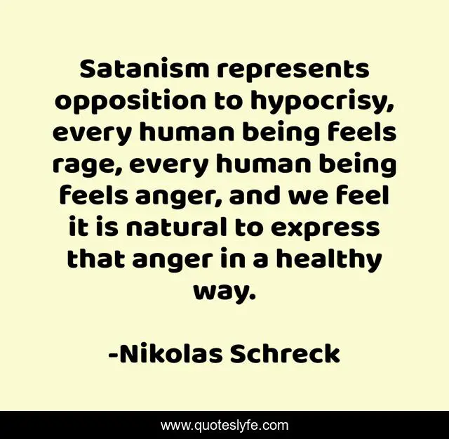 This page presents the quote "Satanism represents opposition to hypocrisy, every human being feels rage, every human being feels anger, and we feel it is natural to express that anger in a healthy way.". Author of this quote is Nikolas Schreck. This quote is about satanism, left-hand-path, satan, satanists,.