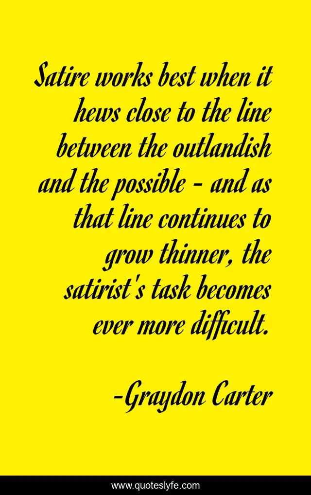 This page presents the quote "Satire works best when it hews close to the line between the outlandish and the possible - and as that line continues to grow thinner, the satirist's task becomes ever more difficult.". Author of this quote is Graydon Carter. This quote is about satire, grow, difficult,.