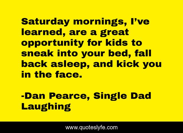 This page presents the quote "Saturday mornings, I’ve learned, are a great opportunity for kids to sneak into your bed, fall back asleep, and kick you in the face.". Author of this quote is Dan Pearce, Single Dad Laughing. This quote is about raising-childrenkids, parenting, children, fatherhood, saturday,.