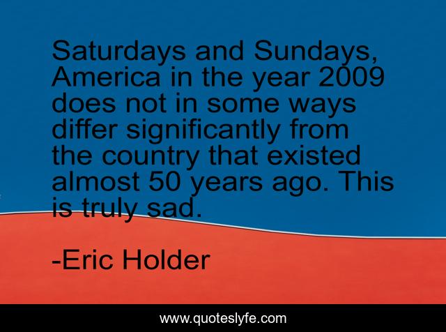 This page presents the quote "Saturdays and Sundays, America in the year 2009 does not in some ways differ significantly from the country that existed almost 50 years ago. This is truly sad.". Author of this quote is Eric Holder. This quote is about country, america, years,.