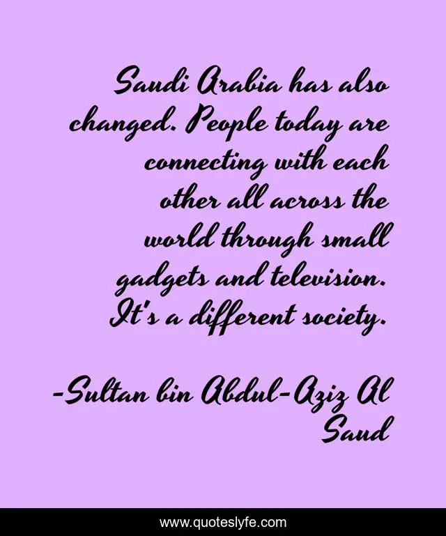 This page presents the quote "Saudi Arabia has also changed. People today are connecting with each other all across the world through small gadgets and television. It's a different society.". Author of this quote is Sultan bin Abdul-Aziz Al Saud. This quote is about small, world, today,.
