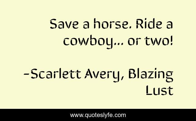 This page presents the quote "Save a horse. Ride a cowboy... or two!". Author of this quote is Scarlett Avery, Blazing Lust. This quote is about romantic-comedy, billionaire-romance, erotic-romance, alpha-males, menage-romance,.