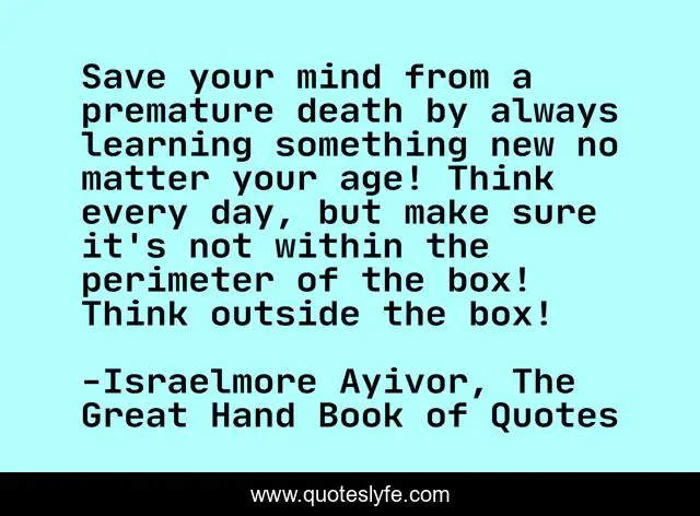 This page presents the quote "Save your mind from a premature death by always learning something new no matter your age! Think every day, but make sure it's not within the perimeter of the box! Think outside the box!". Author of this quote is Israelmore Ayivor, The Great Hand Book of Quotes. This quote is about box, every-day, food-for-thought, death, old, israelmore-ayivor, age, mind, premature,.