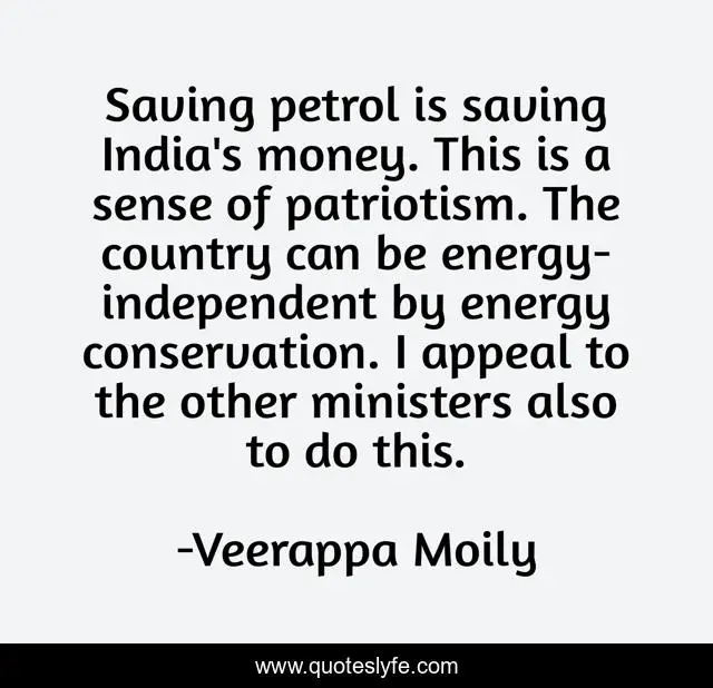 This page presents the quote "Saving petrol is saving India's money. This is a sense of patriotism. The country can be energy-independent by energy conservation. I appeal to the other ministers also to do this.". Author of this quote is Veerappa Moily. This quote is about money, energy, country,.