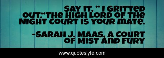 This page presents the quote "Say it, ” I gritted out.“The High Lord of the Night Court is your mate.". Author of this quote is Sarah J. Maas, A Court of Mist and Fury. This quote is about love, spoilers, rhysand, the-suriel, feyrhys, mates, feysand, affection, fey,.
