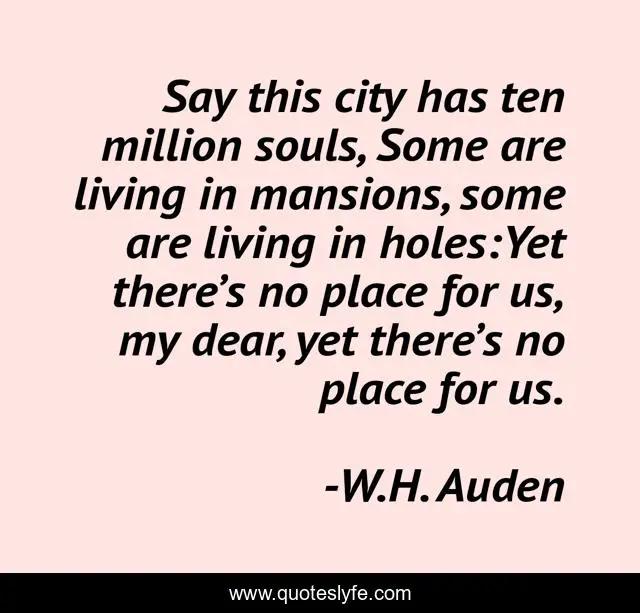 This page presents the quote "Say this city has ten million souls, Some are living in mansions, some are living in holes:Yet there’s no place for us, my dear, yet there’s no place for us.". Author of this quote is W.H. Auden. .
