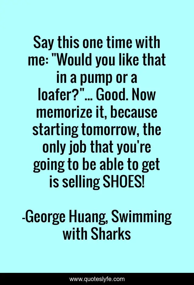 This page presents the quote "Say this one time with me: "Would you like that in a pump or a loafer?"... Good. Now memorize it, because starting tomorrow, the only job that you're going to be able to get is selling SHOES!". Author of this quote is George Huang, Swimming with Sharks. This quote is about sarcasm, job, shoes,.