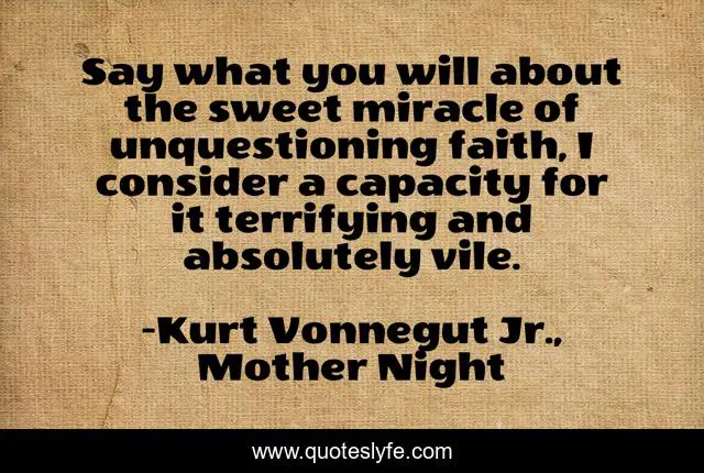 This page presents the quote "Say what you will about the sweet miracle of unquestioning faith, I consider a capacity for it terrifying and absolutely vile.". Author of this quote is Kurt Vonnegut Jr., Mother Night. This quote is about doubt, terrifying, vile,.