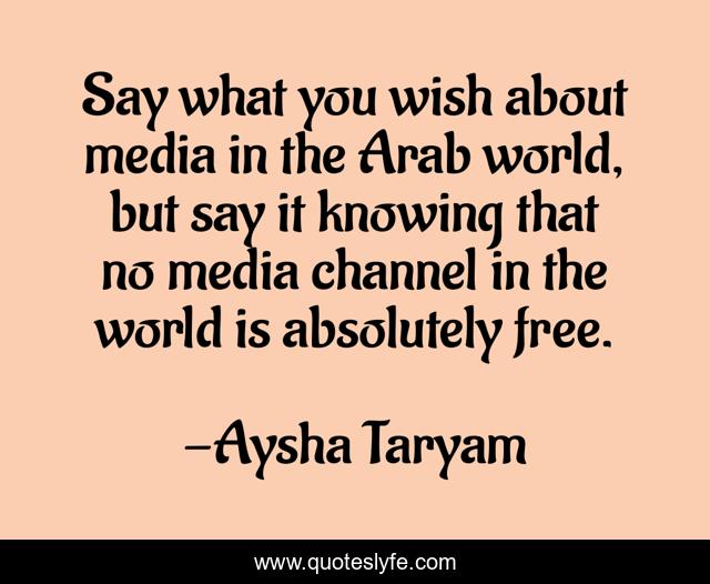This page presents the quote "Say what you wish about media in the Arab world, but say it knowing that no media channel in the world is absolutely free.". Author of this quote is Aysha Taryam. This quote is about journalism, arab-spring, freedom, media-bias, arab-media, arab, media-journalism, freedom-of-the-press, mass-media,.