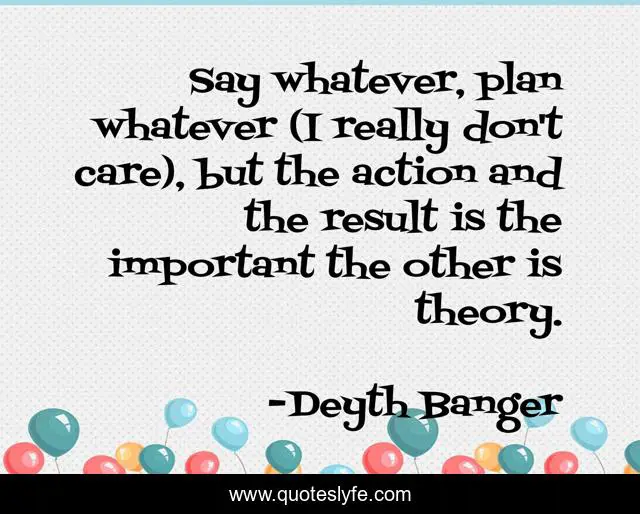 This page presents the quote "Say whatever, plan whatever (I really don't care), but the action and the result is the important the other is theory.". Author of this quote is Deyth Banger. This quote is about action, theory, whatever, care,.