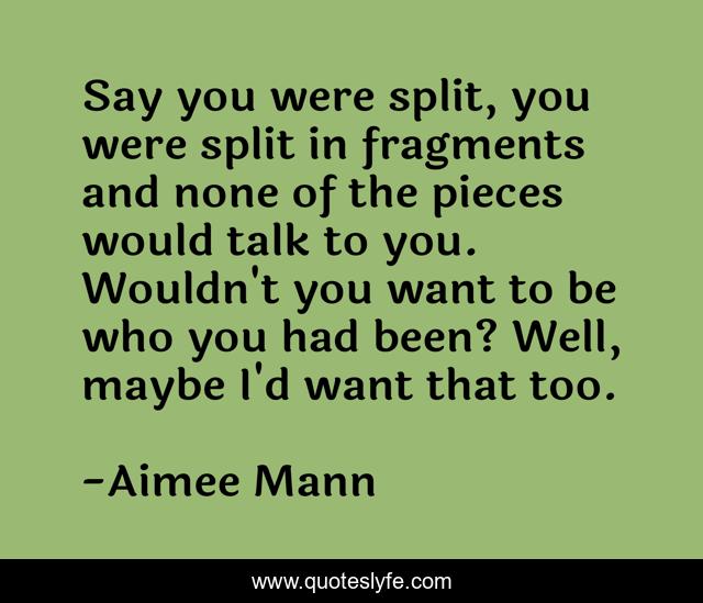 This page presents the quote "Say you were split, you were split in fragments and none of the pieces would talk to you. Wouldn't you want to be who you had been? Well, maybe I'd want that too.". Author of this quote is Aimee Mann. .