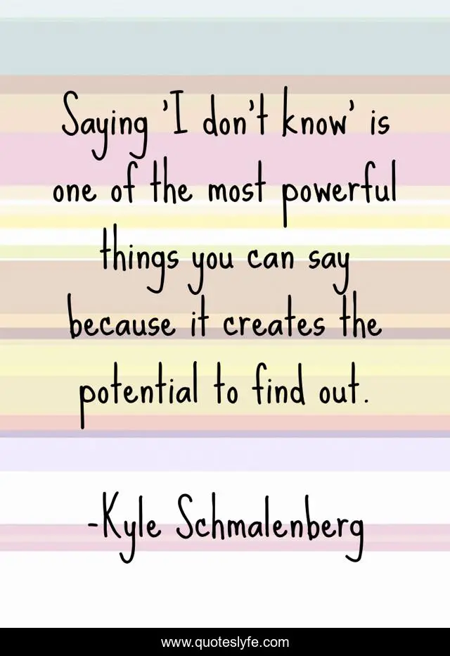 This page presents the quote "Saying 'I don’t know' is one of the most powerful things you can say because it creates the potential to find out.". Author of this quote is Kyle Schmalenberg. This quote is about life, knowledge, wisdom, journey, inspirational, enthusiasm, potential,.