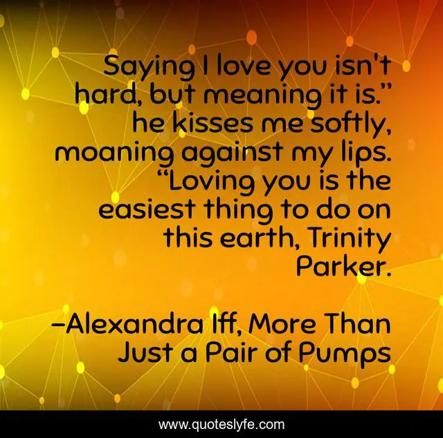 This page presents the quote "Saying I love you isn't hard, but meaning it is.” he kisses me softly, moaning against my lips. “Loving you is the easiest thing to do on this earth, Trinity Parker.". Author of this quote is Alexandra Iff, More Than Just a Pair of Pumps. This quote is about pair-of-pumps, love-story,.