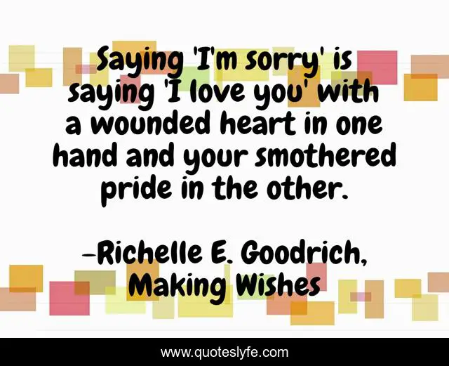 This page presents the quote "Saying 'I'm sorry' is saying 'I love you' with a wounded heart in one hand and your smothered pride in the other.". Author of this quote is Richelle E. Goodrich, Making Wishes. This quote is about love, apology, richelle-e-goodrich, richelle, i-love-you, i-m-sorry, apologize, richelle-goodrich, sorry,.