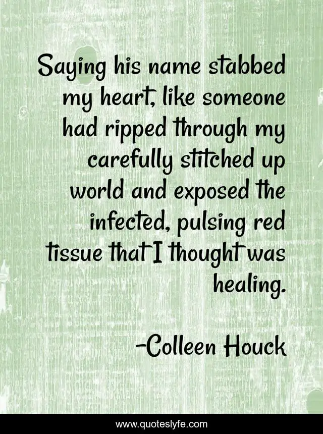 This page presents the quote "Saying his name stabbed my heart, like someone had ripped through my carefully stitched up world and exposed the infected, pulsing red tissue that I thought was healing.". Author of this quote is Colleen Houck. .