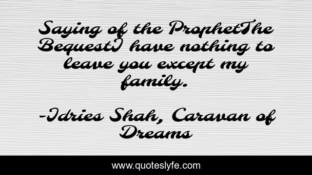 This page presents the quote "Saying of the ProphetThe BequestI have nothing to leave you except my family.". Author of this quote is Idries Shah, Caravan of Dreams. This quote is about religion, god, sufism, muhammad, sufis, islam,.