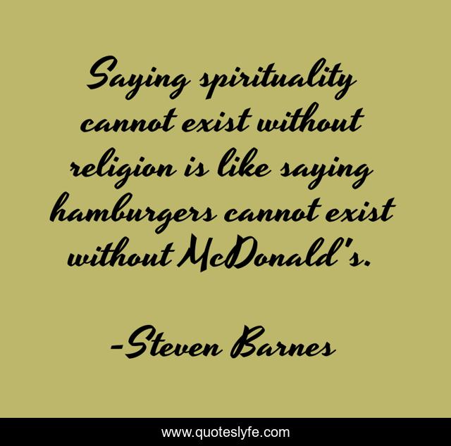 This page presents the quote "Saying spirituality cannot exist without religion is like saying hamburgers cannot exist without McDonald's.". Author of this quote is Steven Barnes. This quote is about religion, hamburgers, spirituality,.