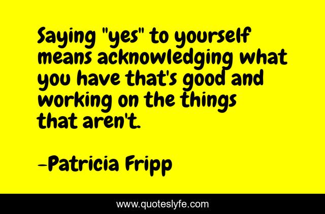 This page presents the quote "Saying "yes" to yourself means acknowledging what you have that's good and working on the things that aren't.". Author of this quote is Patricia Fripp. This quote is about self, knowledge,.