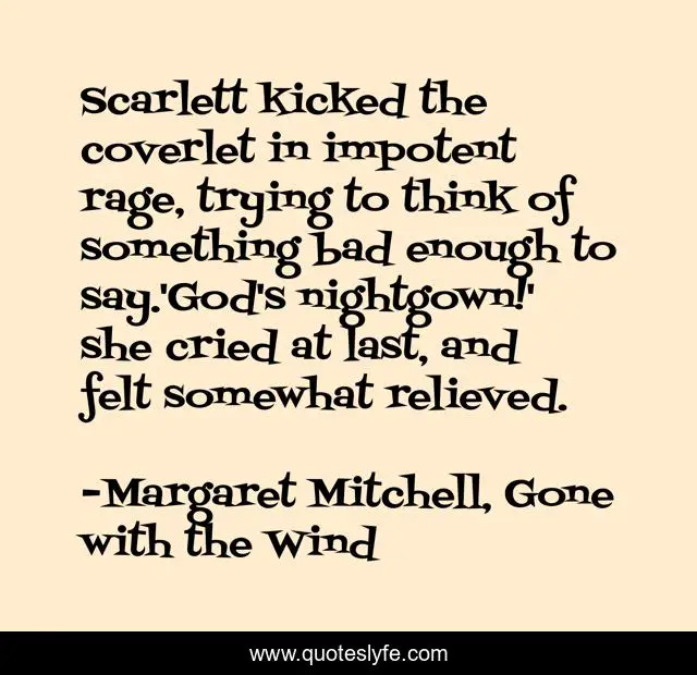 This page presents the quote "Scarlett kicked the coverlet in impotent rage, trying to think of something bad enough to say.'God's nightgown!' she cried at last, and felt somewhat relieved.". Author of this quote is Margaret Mitchell, Gone with the Wind. This quote is about god, bad, impotent, nightgown, rage,.