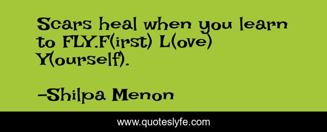 This page presents the quote "Scars heal when you learn to FLY.F(irst) L(ove) Y(ourself).". Author of this quote is Shilpa Menon. This quote is about inspirational, love, healing, affection, enthusiasm,.