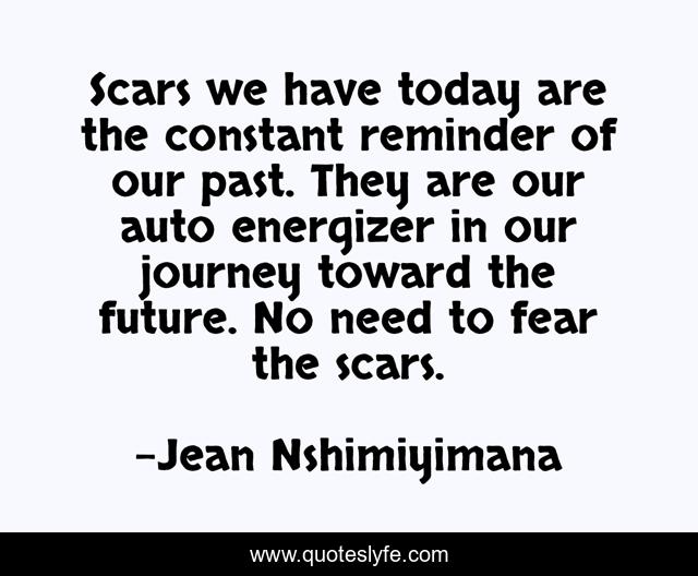 This page presents the quote "Scars we have today are the constant reminder of our past. They are our auto energizer in our journey toward the future. No need to fear the scars.". Author of this quote is Jean Nshimiyimana. This quote is about past, future-of-man, scars,.