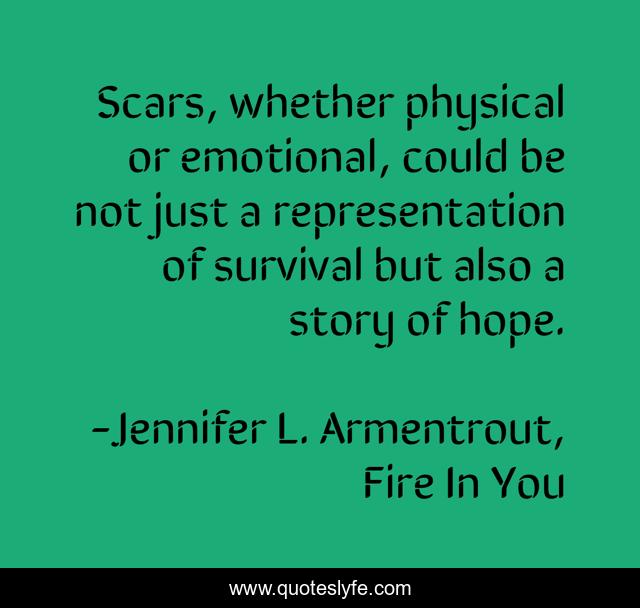 This page presents the quote "Scars, whether physical or emotional, could be not just a representation of survival but also a story of hope.". Author of this quote is Jennifer L. Armentrout, Fire In You. This quote is about scars, hope,.