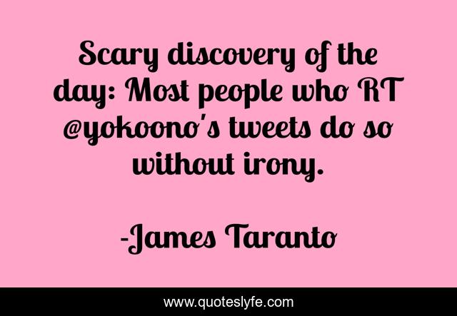 This page presents the quote "Scary discovery of the day: Most people who RT @yokoono's tweets do so without irony.". Author of this quote is James Taranto. This quote is about irony, yoko-ono, 2011, twitter,.