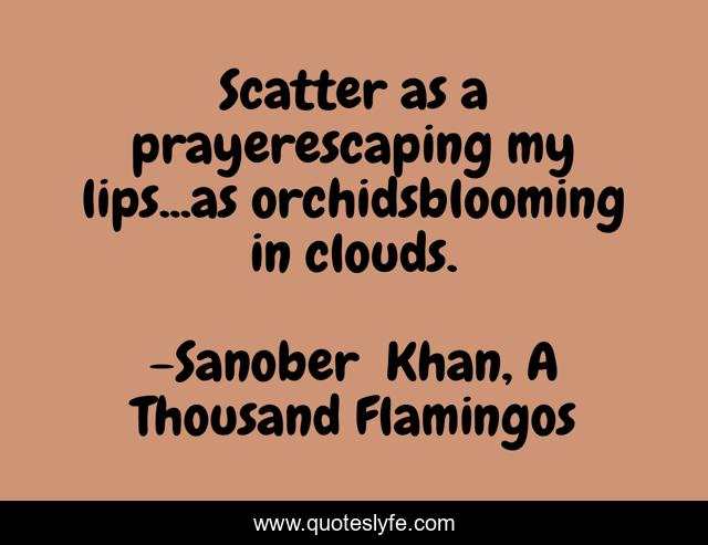 This page presents the quote "Scatter as a prayerescaping my lips...as orchidsblooming in clouds.". Author of this quote is Sanober Khan, A Thousand Flamingos. This quote is about poem, poets, clouds, prayers, free-verse, blooming, indian-authors, poetry, deep,.