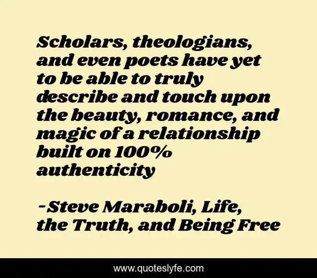This page presents the quote "Scholars, theologians, and even poets have yet to be able to truly describe and touch upon the beauty, romance, and magic of a relationship built on 100% authenticity". Author of this quote is Steve Maraboli, Life, the Truth, and Being Free. This quote is about relationships, life, love, honesty, beauty, positive, motivational, confidence, romance,.