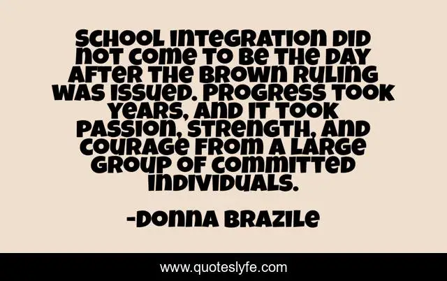 This page presents the quote "School integration did not come to be the day after the Brown ruling was issued. Progress took years, and it took passion, strength, and courage from a large group of committed individuals.". Author of this quote is Donna Brazile. This quote is about school, courage, passion,.