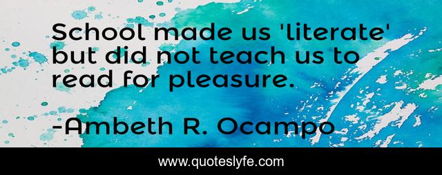 This page presents the quote "School made us 'literate' but did not teach us to read for pleasure.". Author of this quote is Ambeth R. Ocampo. This quote is about literacy, illiteracy, aliteracy, school, reading,.