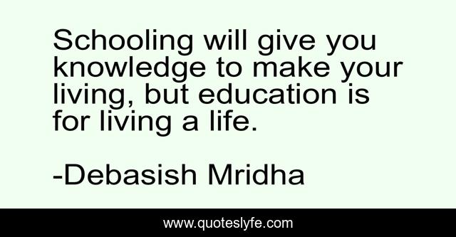 This page presents the quote "Schooling will give you knowledge to make your living, but education is for living a life.". Author of this quote is Debasish Mridha. This quote is about life, love, knowledge, inspirational, intelligence, philosophy, school, wisdom, affection,.