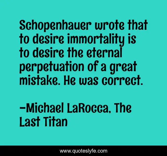 This page presents the quote "Schopenhauer wrote that to desire immortality is to desire the eternal perpetuation of a great mistake. He was correct.". Author of this quote is Michael LaRocca, The Last Titan. This quote is about life, novel, gods, philosophy, fiction, immortality,.