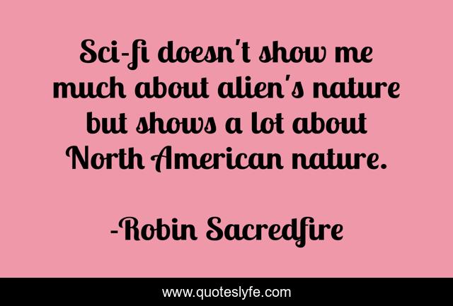 This page presents the quote "Sci-fi doesn't show me much about alien's nature but shows a lot about North American nature.". Author of this quote is Robin Sacredfire. This quote is about et, aliens, scifi, science-fiction,.
