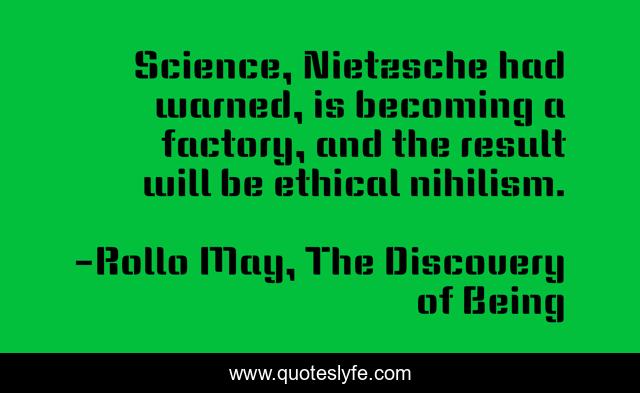 This page presents the quote "Science, Nietzsche had warned, is becoming a factory, and the result will be ethical nihilism.". Author of this quote is Rollo May, The Discovery of Being. This quote is about nietzsche, science, nihilism,.