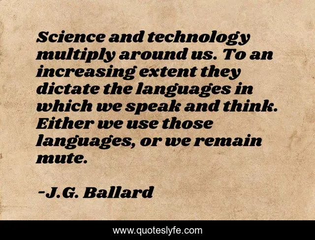 This page presents the quote "Science and technology multiply around us. To an increasing extent they dictate the languages in which we speak and think. Either we use those languages, or we remain mute.". Author of this quote is J.G. Ballard. This quote is about ballard, technology, language, science,.