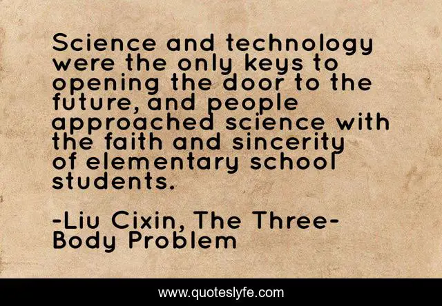This page presents the quote "Science and technology were the only keys to opening the door to the future, and people approached science with the faith and sincerity of elementary school students.". Author of this quote is Liu Cixin, The Three-Body Problem. This quote is about science, technology,.