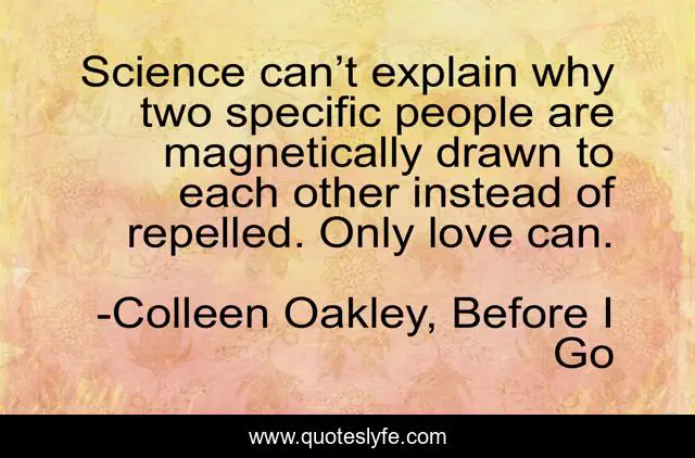 This page presents the quote "Science can’t explain why two specific people are magnetically drawn to each other instead of repelled. Only love can.". Author of this quote is Colleen Oakley, Before I Go. This quote is about love, affection,.