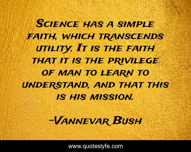This page presents the quote "Science has a simple faith, which transcends utility. It is the faith that it is the privilege of man to learn to understand, and that this is his mission.". Author of this quote is Vannevar Bush. This quote is about simple, faith, man,.