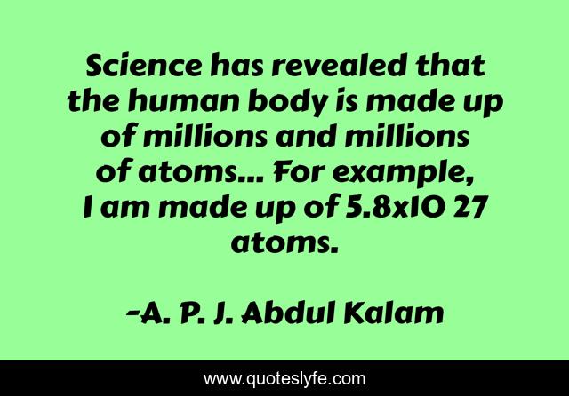 This page presents the quote "Science has revealed that the human body is made up of millions and millions of atoms... For example, I am made up of 5.8x10 27 atoms.". Author of this quote is A. P. J. Abdul Kalam. This quote is about body, human,.