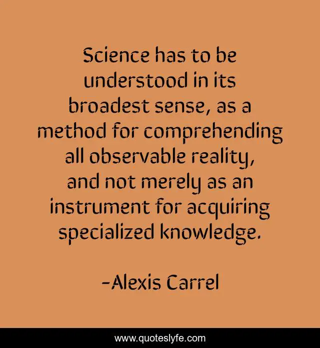 This page presents the quote "Science has to be understood in its broadest sense, as a method for comprehending all observable reality, and not merely as an instrument for acquiring specialized knowledge.". Author of this quote is Alexis Carrel. This quote is about science, reality, sense,.