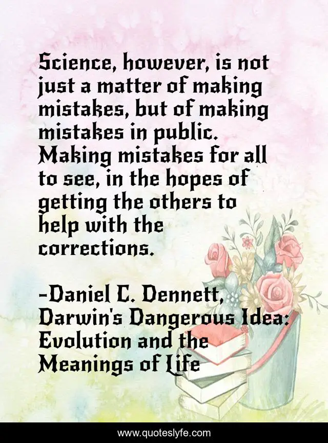 This page presents the quote "Science, however, is not just a matter of making mistakes, but of making mistakes in public. Making mistakes for all to see, in the hopes of getting the others to help with the corrections.". Author of this quote is Daniel C. Dennett, Darwin's Dangerous Idea: Evolution and the Meanings of Life. .