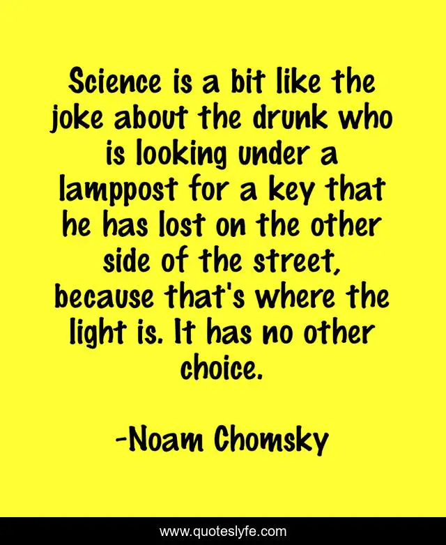 This page presents the quote "Science is a bit like the joke about the drunk who is looking under a lamppost for a key that he has lost on the other side of the street, because that's where the light is. It has no other choice.". Author of this quote is Noam Chomsky. .