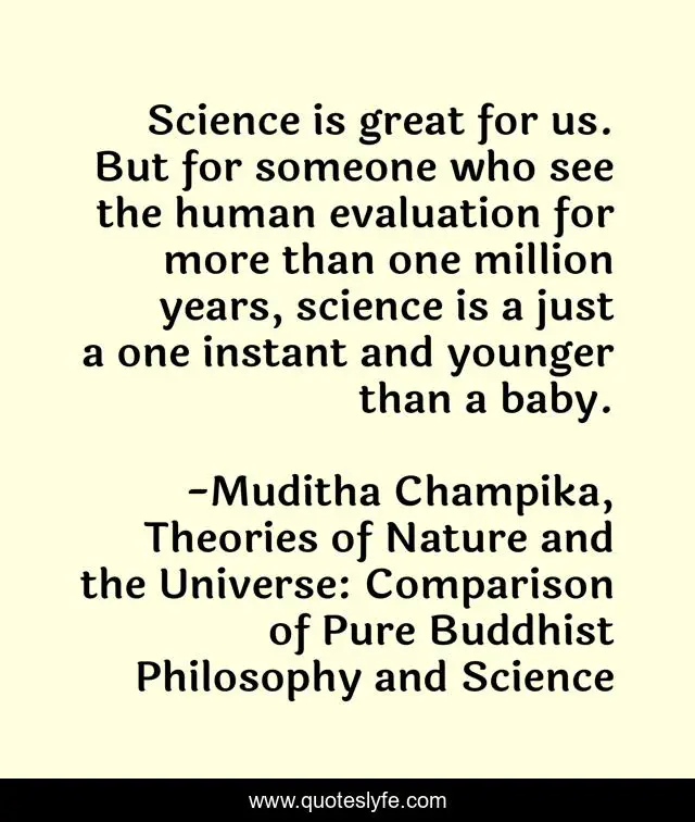 This page presents the quote "Science is great for us. But for someone who see the human evaluation for more than one million years, science is a just a one instant and younger than a baby.". Author of this quote is Muditha Champika, Theories of Nature and the Universe: Comparison of Pure Buddhist Philosophy and Science. This quote is about reality-of-life, science-vs-religion, nature, science, science-and-religion, reality, life-after-death, theories-of-nature, nature-lows,.