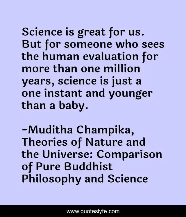This page presents the quote "Science is great for us. But for someone who sees the human evaluation for more than one million years, science is just a one instant and younger than a baby.". Author of this quote is Muditha Champika, Theories of Nature and the Universe: Comparison of Pure Buddhist Philosophy and Science. This quote is about beginning-of-the-universe, what-is-science, reality-of-life, big-picture, space, god, ultimate-reality, reality, out-of-the-box,.