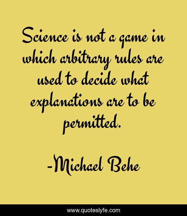 This page presents the quote "Science is not a game in which arbitrary rules are used to decide what explanations are to be permitted.". Author of this quote is Michael Behe. This quote is about rules, game, decide,.