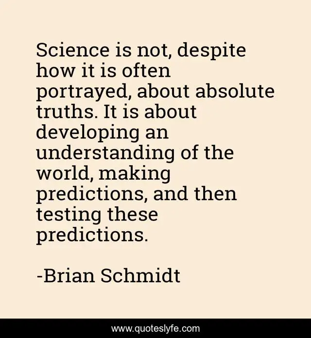 This page presents the quote "Science is not, despite how it is often portrayed, about absolute truths. It is about developing an understanding of the world, making predictions, and then testing these predictions.". Author of this quote is Brian Schmidt. This quote is about world, understanding,.