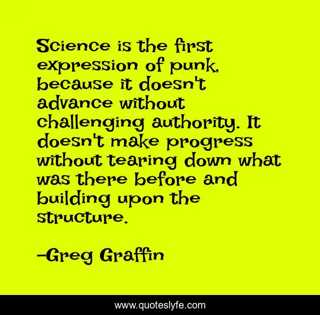 This page presents the quote "Science is the first expression of punk, because it doesn't advance without challenging authority. It doesn't make progress without tearing down what was there before and building upon the structure.". Author of this quote is Greg Graffin. This quote is about building, progress, down,.
