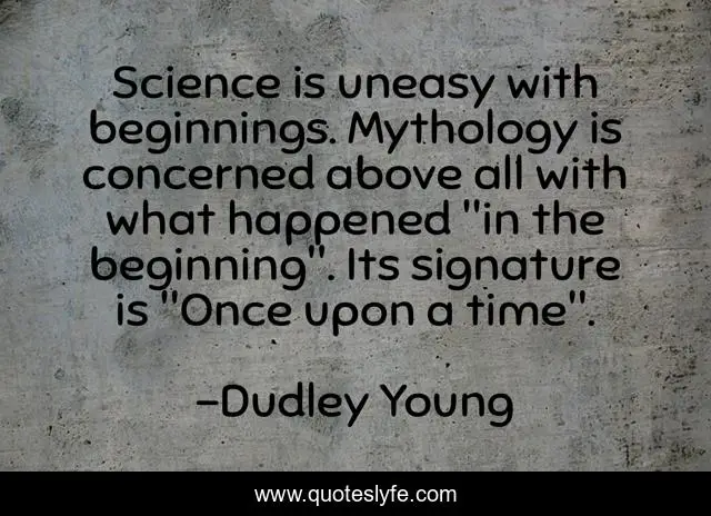 This page presents the quote "Science is uneasy with beginnings. Mythology is concerned above all with what happened "in the beginning". Its signature is "Once upon a time".". Author of this quote is Dudley Young. .